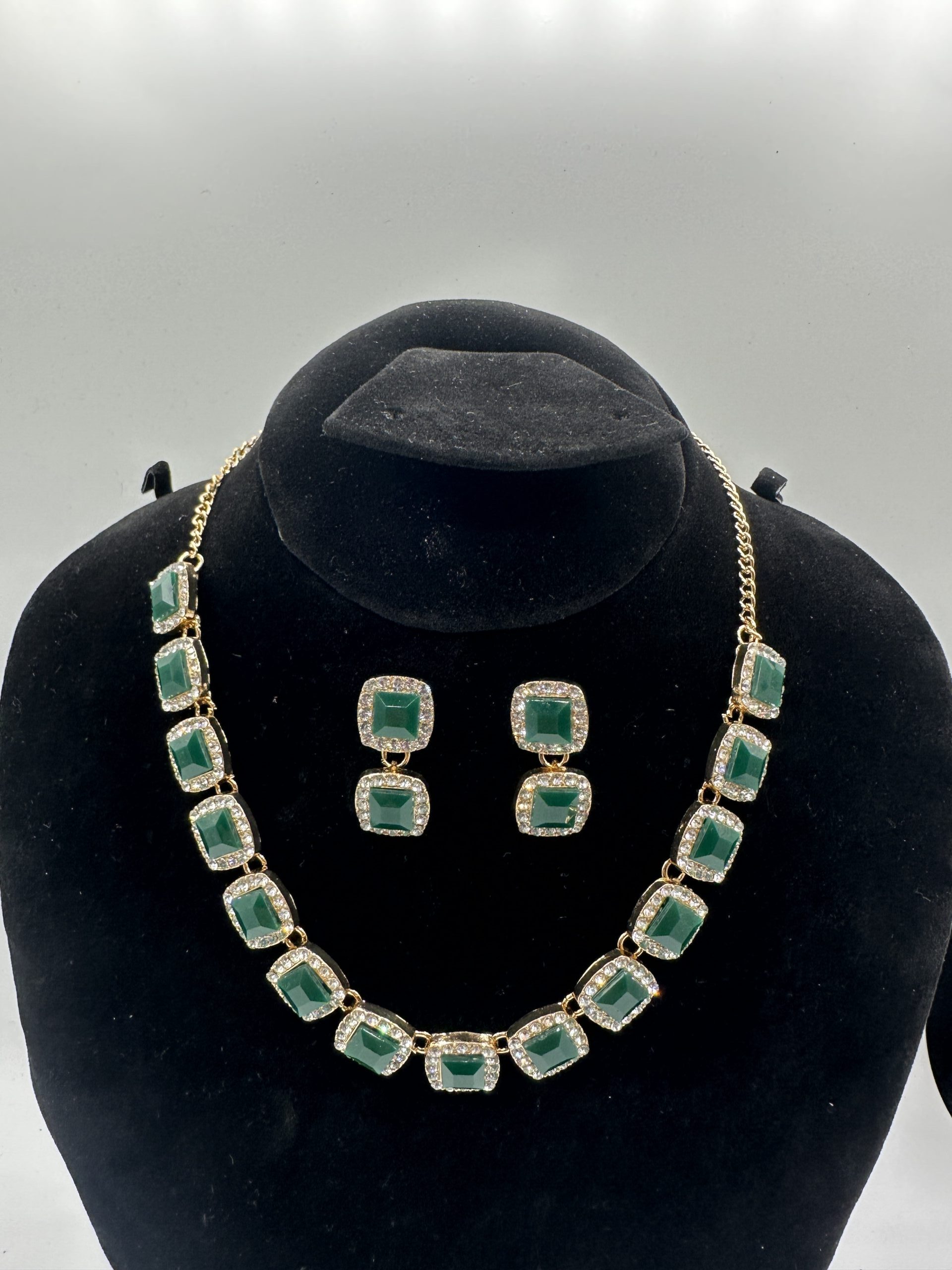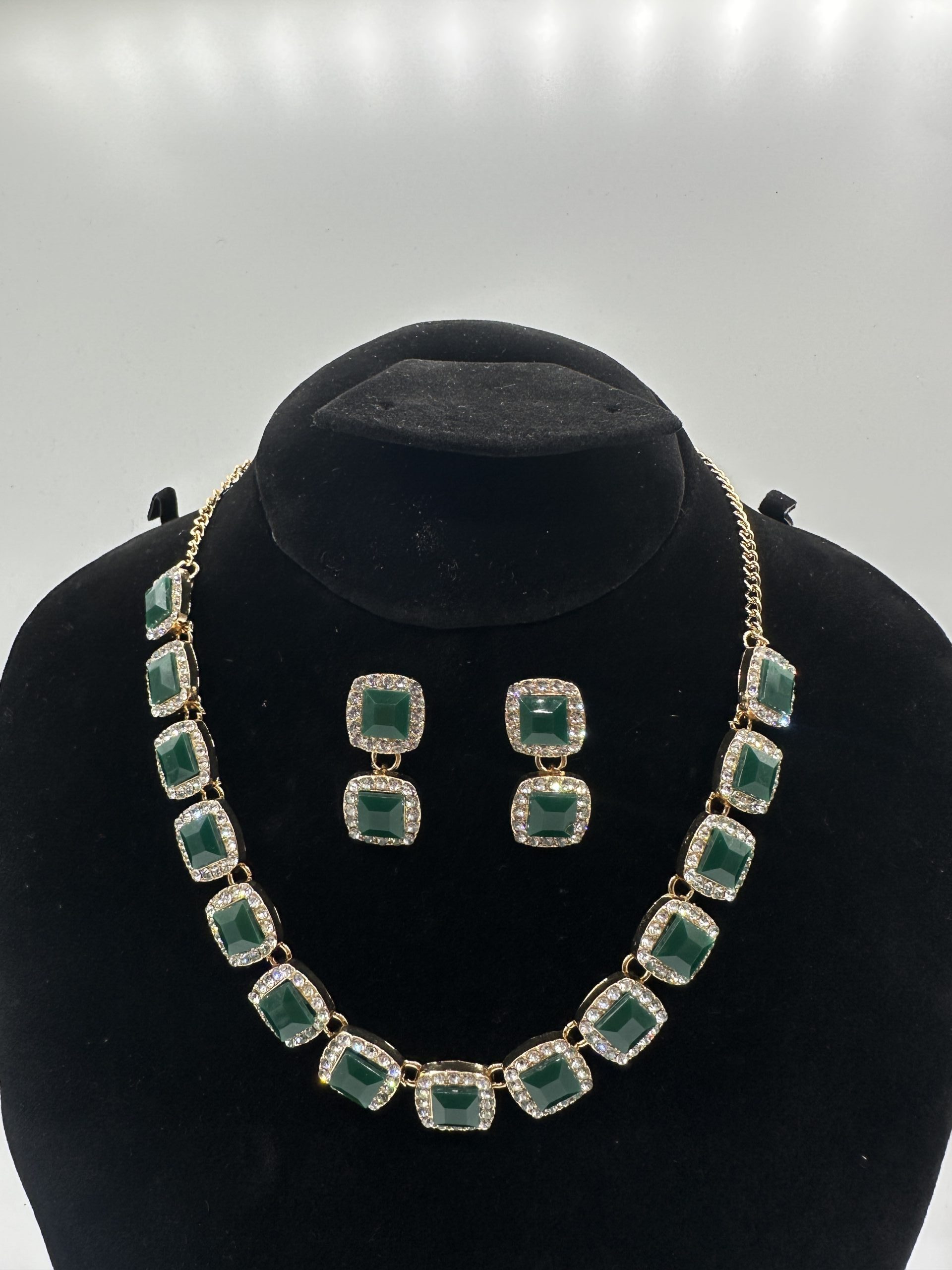 Elegant and eye-catching, this set features a green stone locket on a sleek golden chain with matching earrings. Perfect for special occasions or adding a touch of glamour to everyday outfits.